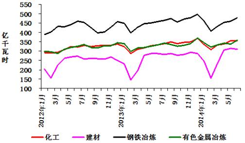 1-6月份,化學(xué)原料制品、非金屬礦物制品、黑色金屬冶煉、有色金屬冶煉四大高載能行業(yè)用電量合計8314億千瓦時,同比增長 4.6%,增速比上年同期提高0.4個百分點;合計用電量占全社會用電量的比重為31.6%,對全社會用電量增長的貢獻率為27.8%。其中,化工行業(yè)用電量2025億千瓦時,同比增長5.2%,增速比上年同期提高0.7個百分點;建材行業(yè)用電量1563億千瓦時,同比增長9.3%,增速比上年同期提高6.2個百分點;黑色金屬冶煉行業(yè)用電量2689億千瓦時,同比增長1.7%,增速比上年同期回落1.9個百分點,對全社會用電量增長的貢獻率僅為3.3%;有色金屬冶煉行業(yè)2037億千瓦時,同比增長4.7%,增速比上年同期回落1.0個百分點。
